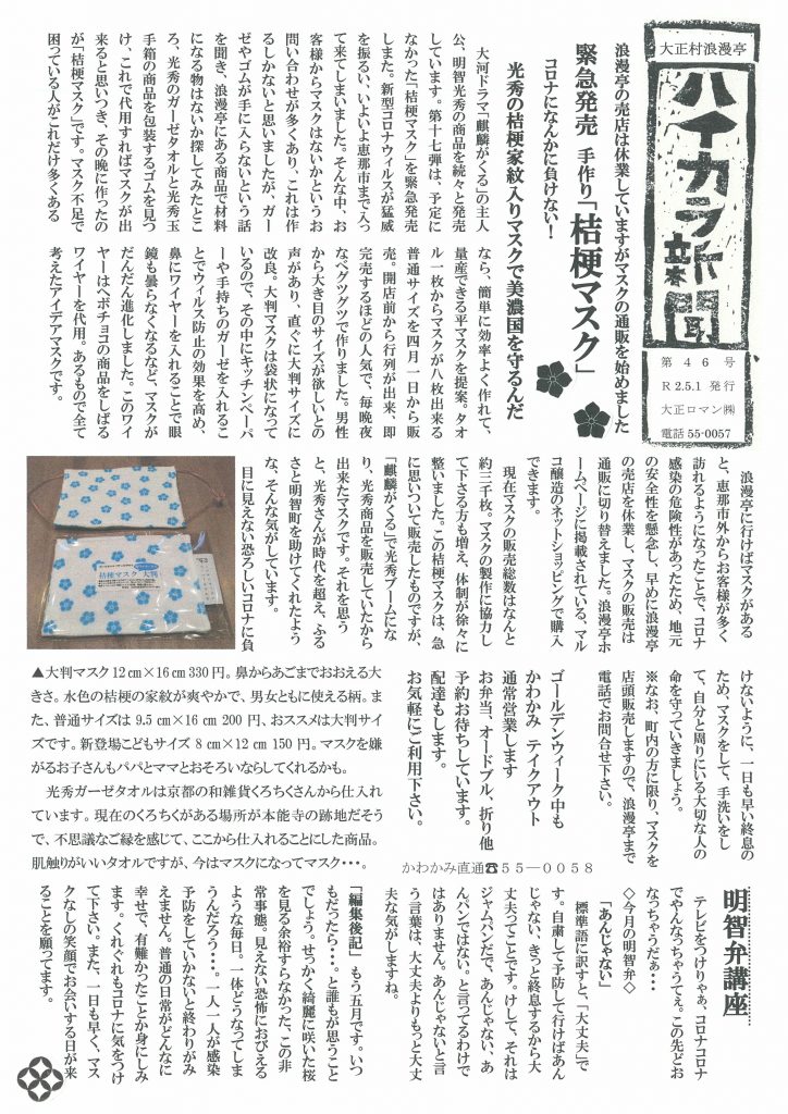 ガーゼタオルで作った「桔梗紋入布マスク」ネット販売開始しました