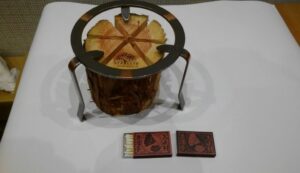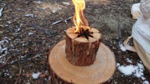 間伐の檜を使用したスウェーデントーチ1つに大正村浪漫亭オリジナルデザインのマッチが2個ついたセットです。スウェーデントーチは丸太に切り目を入れるシンプルな構造ながら、燃焼効率が良く、見た目のおしゃれさからも今大注目の焚火アイテムです。紙やティッシュをトーチの中心の割れ目に詰め、サラダ油など少し注いで着火し、火がついたら五徳(別売、税込1,320円)を置いて調理します。どんな器具でも調理が可能です。