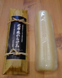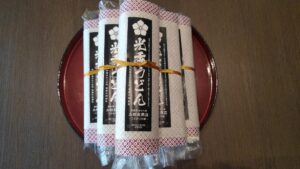 通常のうどんの長さのほぼ半分と短く、光秀の天下が短かったことを現していますが、地元の人から長年愛されているうどんです。うどんの長さは15㎝、通常は25㎝。巻物風にラッピングしてあります。短いので小鍋で茹でることができ、お子様やご年配の方にもツルンと食べられると好評です。