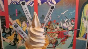 光秀醤油を使用して作った醤油味のソフトクリームに、「明智光秀」「白鷹城」「土岐明智城」の三種類ののぼり旗に見立てたスティックをさして、戦国時代絵巻をバックに写真が撮れる、インスタ映えを狙ったソフトクリームを発売しました。