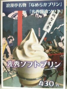 大正村浪漫亭で好評販売中のなめらかプリンの上に、光秀醤油ソフトクリームを乗せたアイデア商品♪