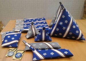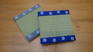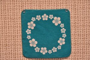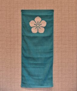 地元恵那市明智町の三宅畳店が作成した、オリジナルデザイン光秀桔梗家紋入り畳の縁を用いて作成した商品です。縁の色は青とグレーの2種類あります。