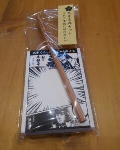 地元のお肉屋さんのすきやきコロッケに明智光秀の家紋のききょうの形のゼリー、そしておまけに「光秀鉛筆」がついてきます。