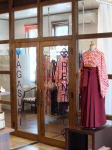 矢がすり袴のレンタルです。浪漫亭または大正村役場で着付けをします。